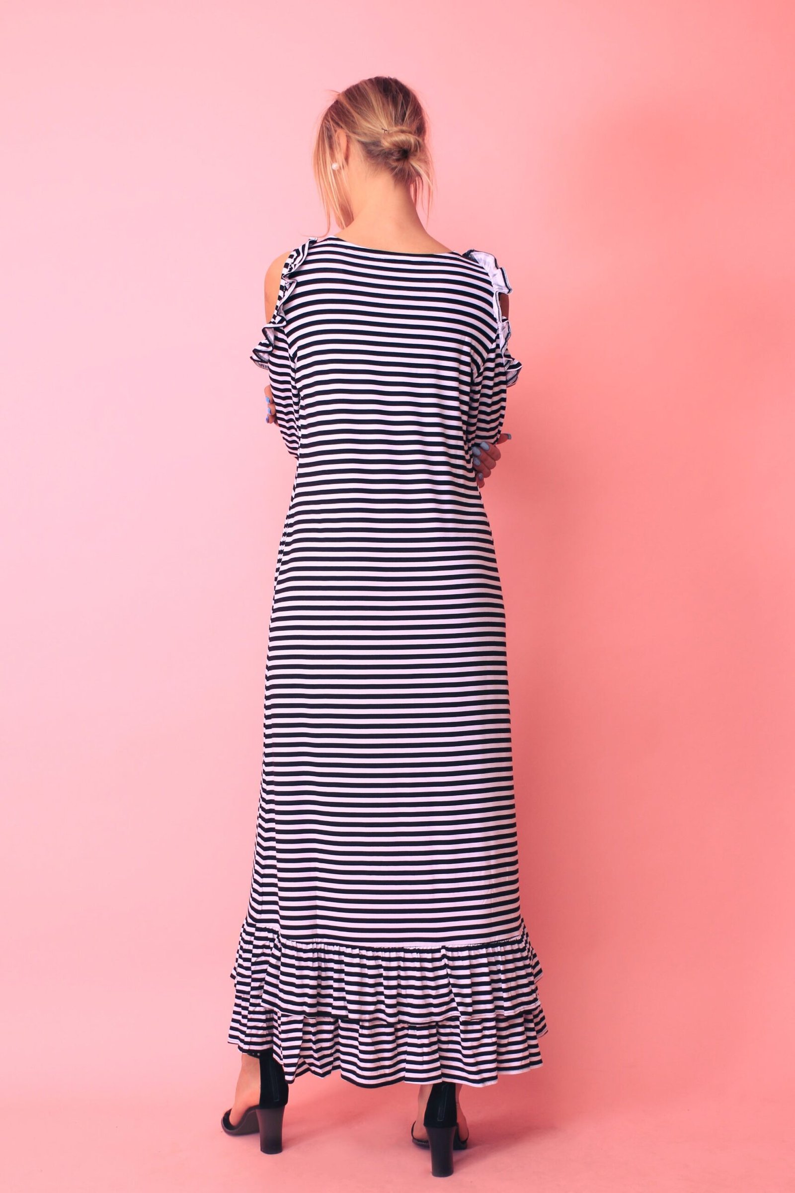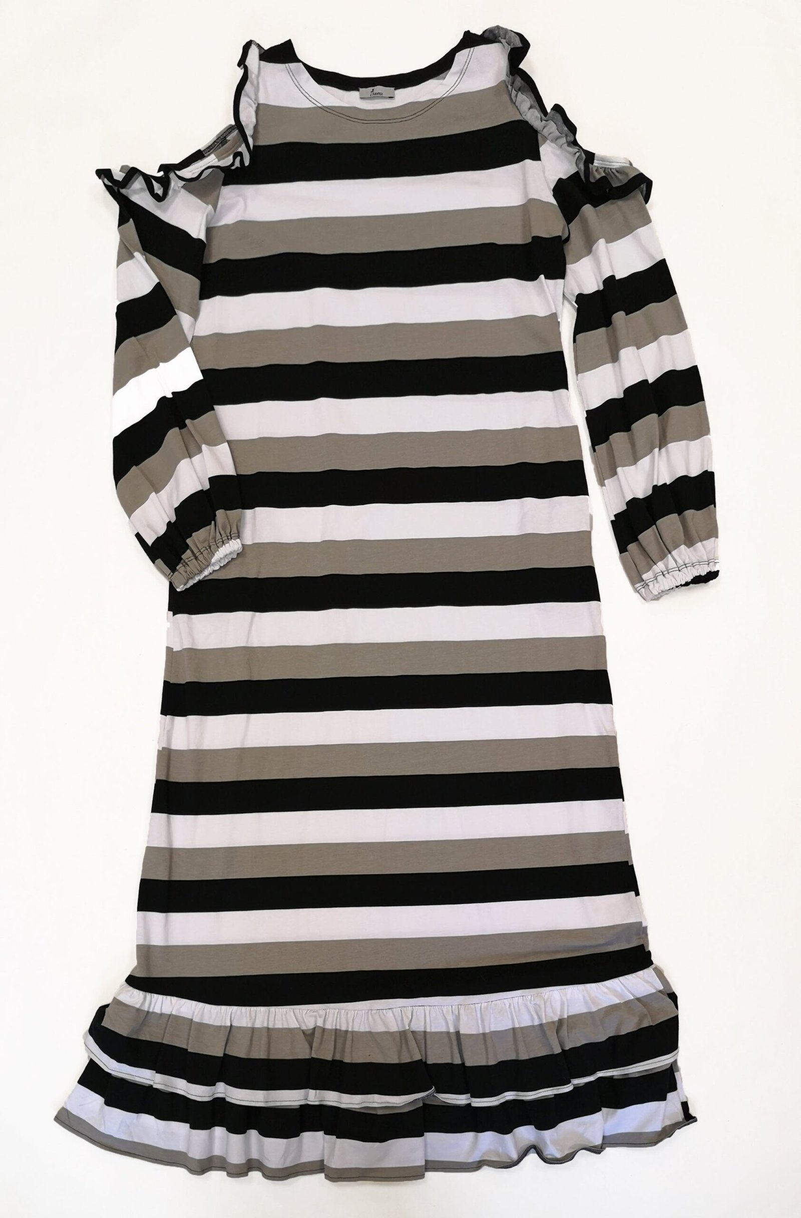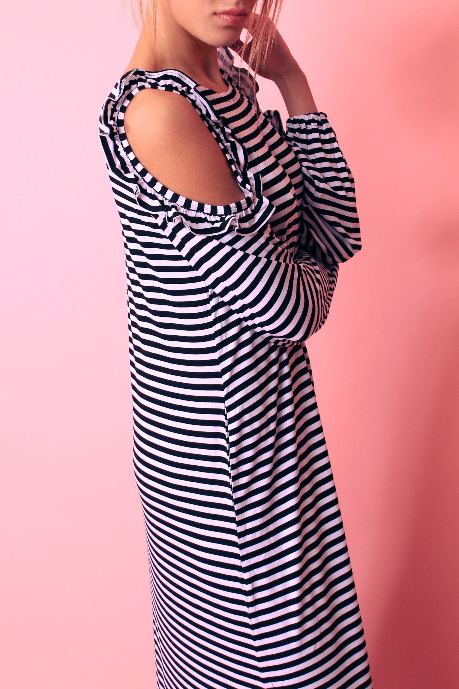 - rankovės ties pečiais iškirptos, kraštai dekoruoti raukiniais, suknelės apačia dekoruota plačiais sluoksniuotais raukiniais;