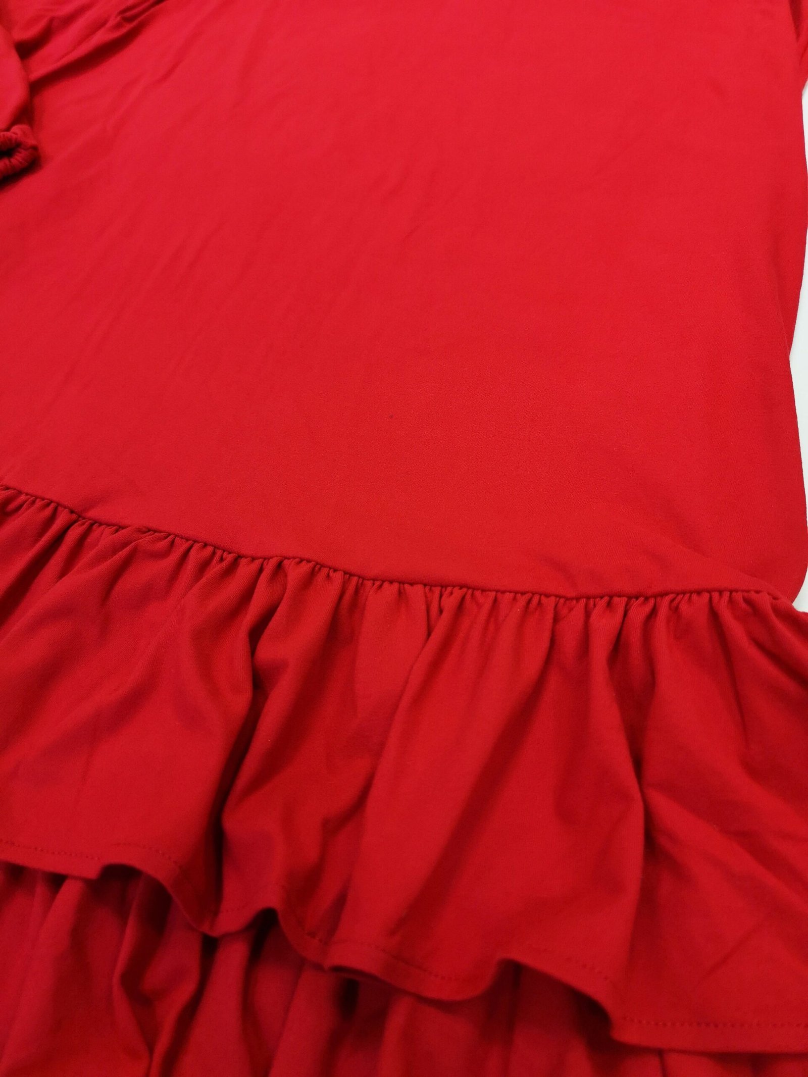 - rankovės ties pečiais iškirptos, kraštai dekoruoti raukiniais, suknelės apačia dekoruota plačiais sluoksniuotais raukiniais;